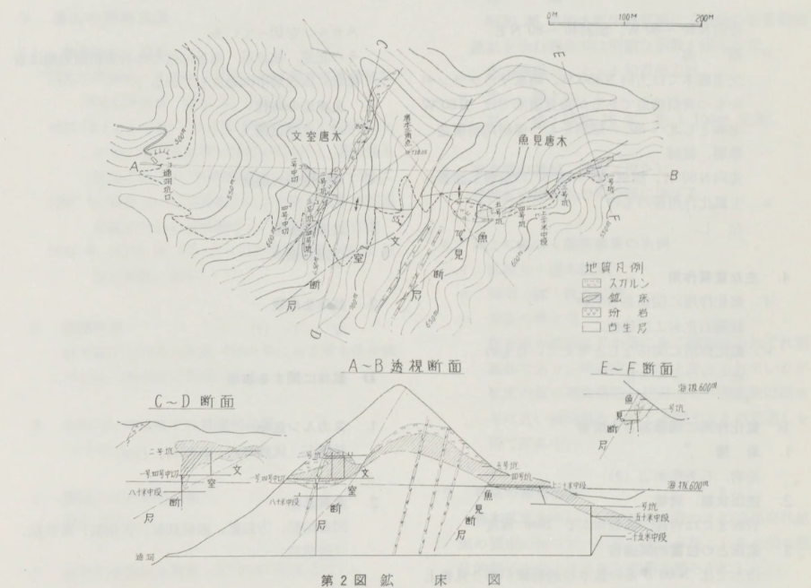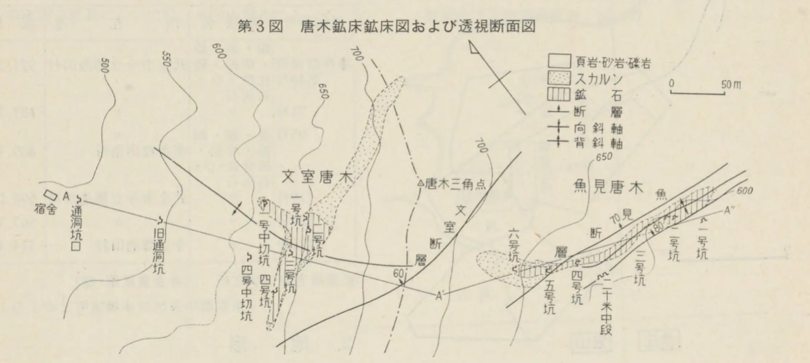 主な鉱床には唐木鉱床が有り、褶曲した層に沿って肥大した石灰岩を交代した鉱床でパイプ状となっています。