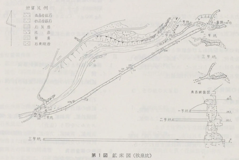 昭和30年及び31年の調査時点で矢坪鉱山は稼行していましたが、牧泉鉱床の坑道は落盤しており、佐倉鉱床は1号坑道から7号坑道まで開削されてました。