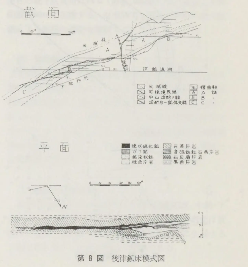 鉱脈に含まれる金属鉱物には、黄鉄鉱、黄銅鉱、斑銅鉱、閃亜鉛鉱、磁硫鉄鉱が有り、中粒緻密な塊状および縞状となっていました。